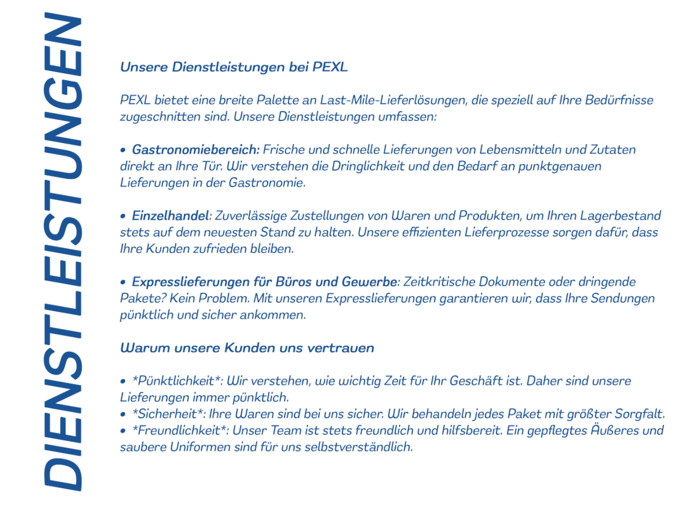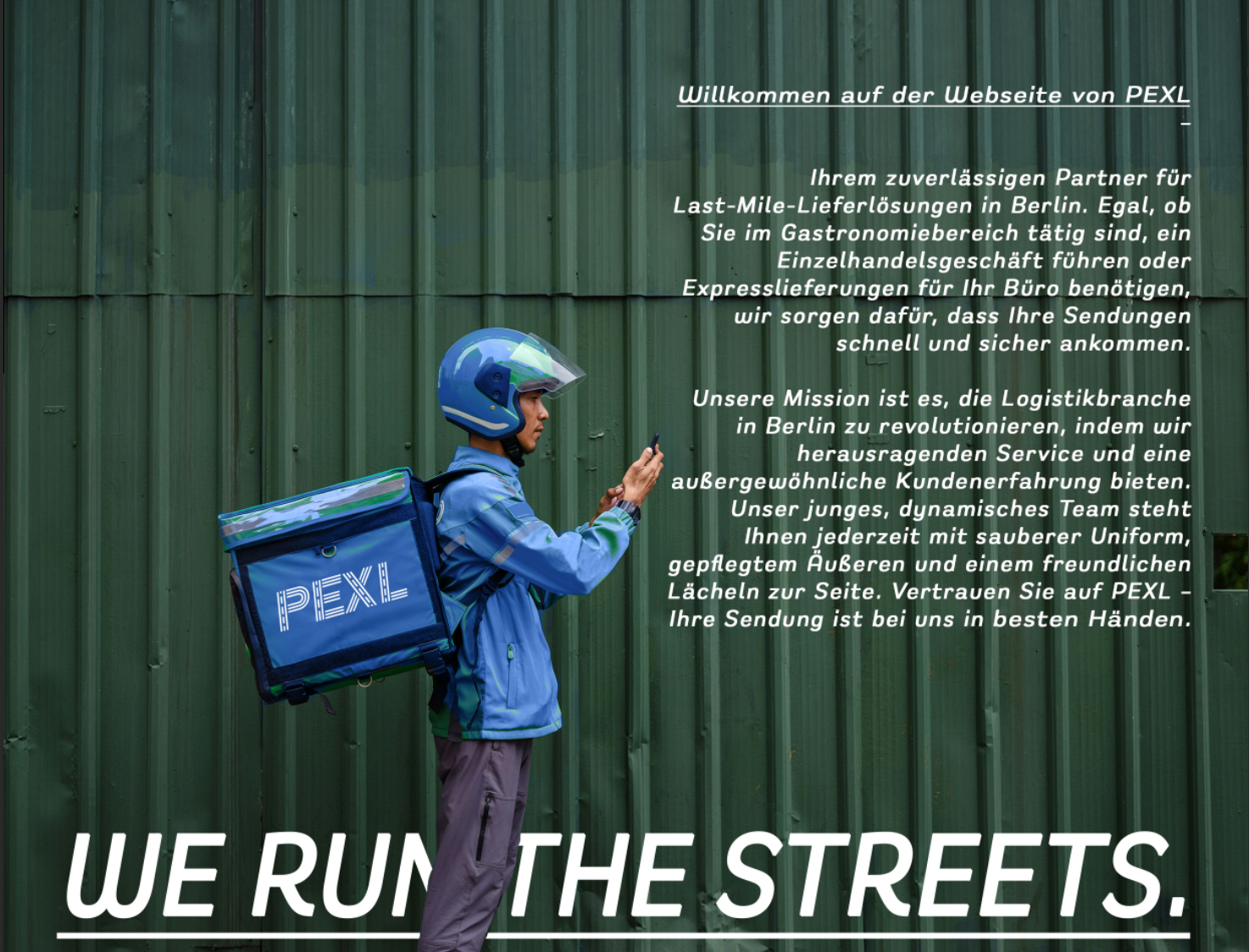 PEXL wurde mit der Vision gegründet, die Last-Mile-Logistik in Berlin zu verbessern. Unsere Mission ist es, durch innovative und zuverlässige Lieferlösungen den höchsten Standard in der Branche zu setzen. Wir sind stolz darauf, ein junges und motiviertes Team zu haben, das stets bestrebt ist, unsere Kunden glücklich zu machen.